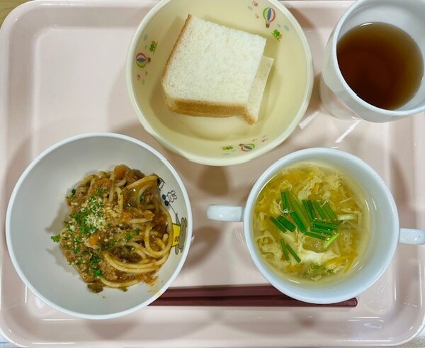 今日は1カ月で1回の貴重なパスタの日♪パスタは食べやすいようで子ども達に人気のメニューです!