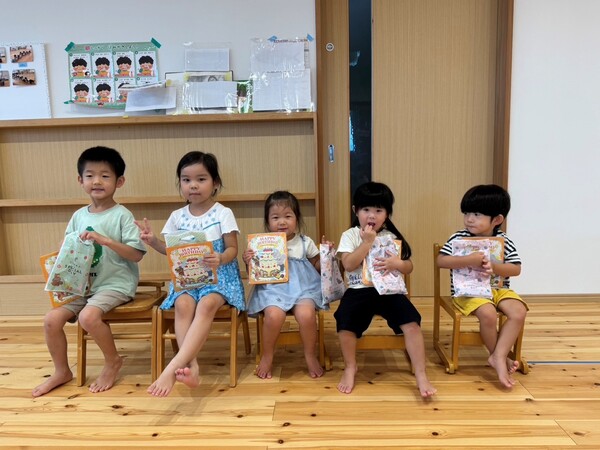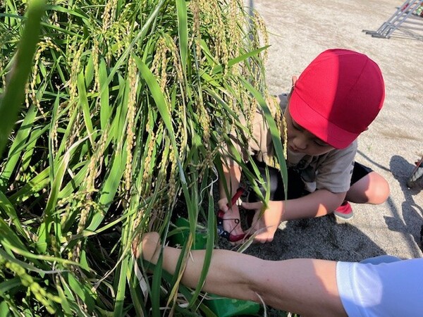 ハサミを使って以上児さんが収穫を手伝ってくれました。稲を切るのは硬く、結構な力作業でしたが「楽しい!」と何回も手伝ってくれるお友だちもいました。束をまとめて天日干し・・・乾燥したら脱穀→精米・・・いろんな作業を経て年末の餅付きでたべられるといいな〜(^^)/