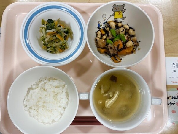 今日は和食メニューでした。大豆を箸やスプーンを使って一生懸命食べる子ども達でした。大豆には良質なたんぱく質が含まれています。たくましい体作りや、脳の動きを活発にするそうですよ。大人も子供も進んで食べたい食材ですね!三色ナムルはもやし、人参、ほうれん草が入っていて、甘酸っぱい味付けでした。