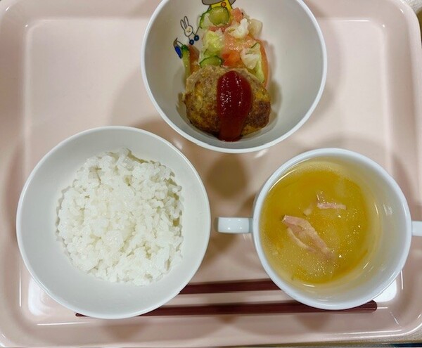 「今日はハンバーグだ‼」と朝から楽しみにしている子も多く、いただきますをするとすぐにハンバーグを食べ始めていました(^^)