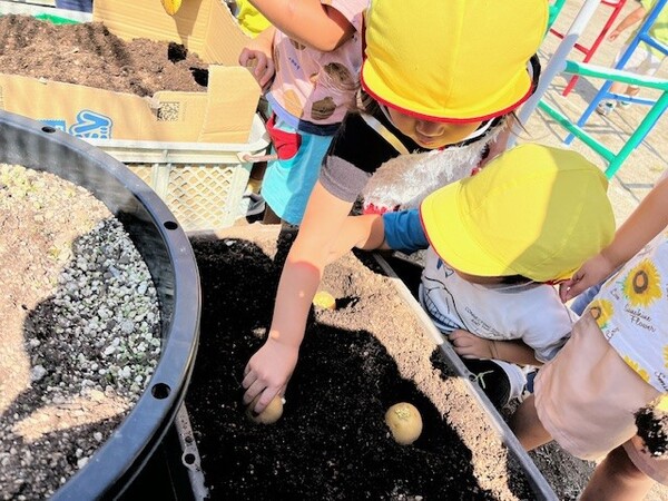 じゃがいもの種芋をうえました!未満児さんが先生と一緒にお手伝い。収穫したら何にして食べる?「ポテトチップス!」「フライドポテト!」「ポテトサラダ!」・・・楽しみは膨らみます〜♪