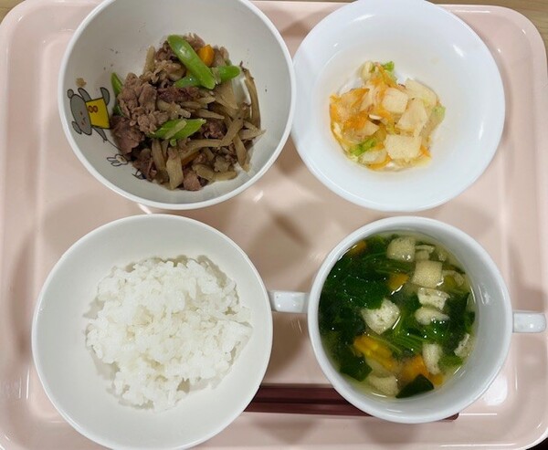 牛肉とごぼうの炒め煮は、ごぼうの食感がアクセントになって美味しかったです。子ども達は食べ慣れないのか、少しずつ食べている子が多かったです。ごぼうには整腸効果があり、野菜の中でもトップクラスの食物繊維が含まれています!便秘でお困りのお子さんにはおススメの食材です☆