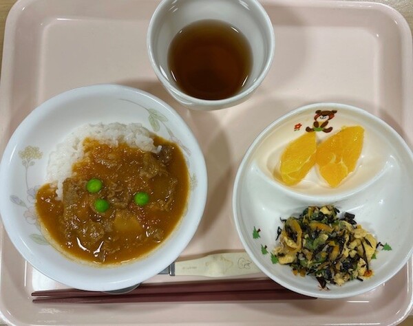 今日の給食を見て「やったー!カレーだぁー!」と言う子ども達・・・「これはトマトを使ったハヤシライスていう食べ物だよ〜」「匂いをかいでみて、カレーとちょっと違うにおいがするよ」とお話をしました。苦手な子もいましたが、好きな子もたくさんいました!