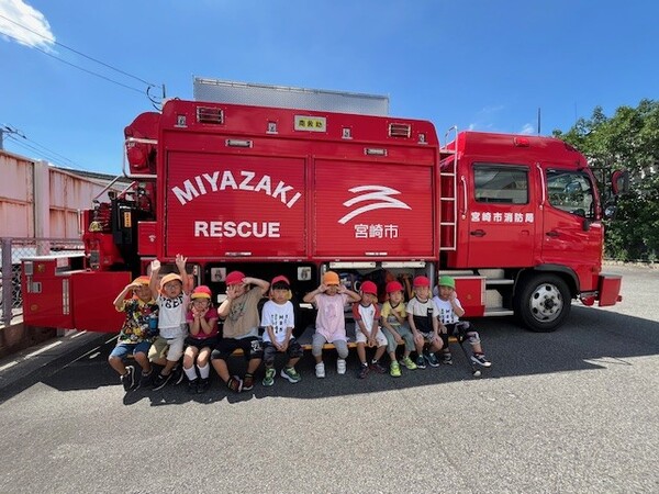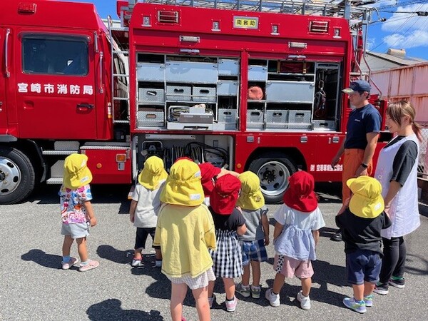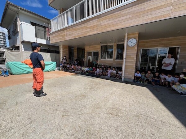 南消防署の消防士さんが来て下さって、私たちの訓練の様子を見てくださりました。火事の時の避難の仕方を見て、アドバイスをしてもらいます☆子ども達も消防士さんの話は真剣に聞いているようでした。