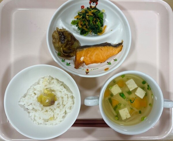 普段給食では白ごはんが多いので、子どもたちは栗の入ったご飯を見つめている子もいましたが、食べてみると美味しかったようです(^_^)
