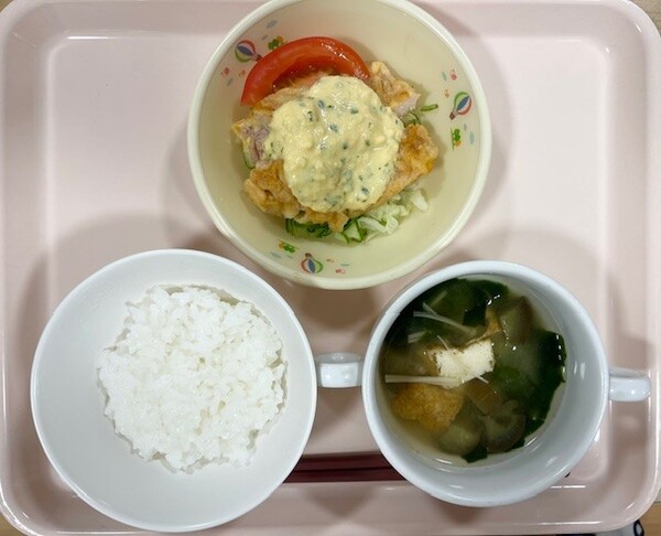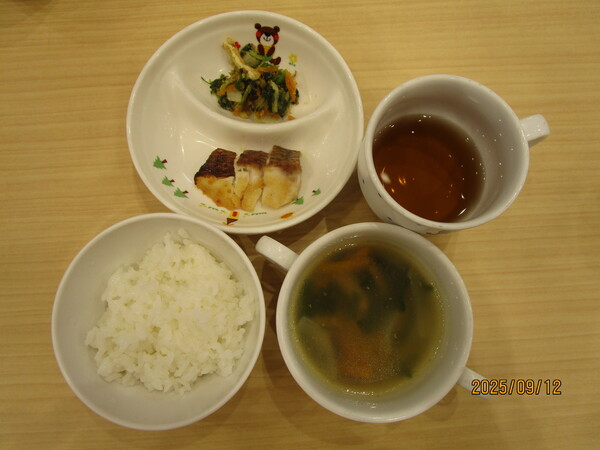 今日の魚は鯛でした。味噌やバター砂糖等で下味をつけて、焼いてあります。魚はふっくらで、味噌とバターの風味も良くて、子どもたちは真っ先に食べていました!