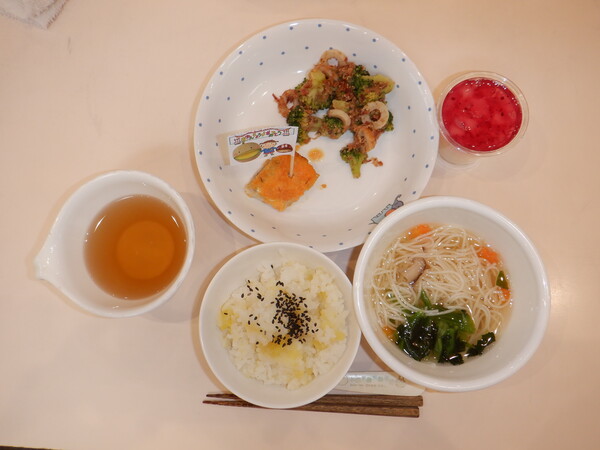 いもごはん・魚のもみじ焼き・ブロッコリーのごまおかか和え・すまし汁・カルピスゼリー
