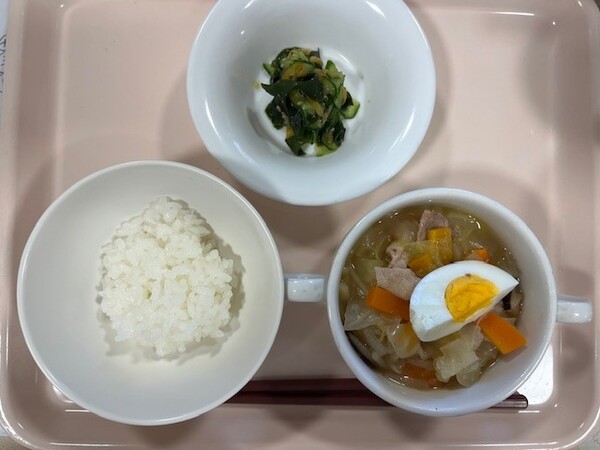 ごはん・大根のみそ煮・ほうれん草の納豆和え・かきたまスープ