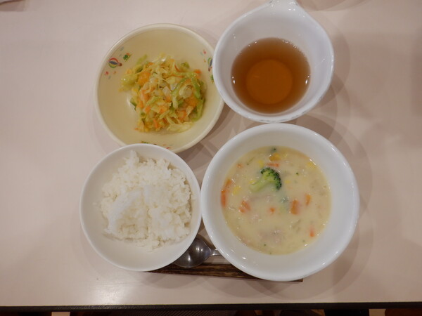 シチューはクリームコーンとホールコーンがたっぷりで、体を長く温めてくれます。サラダは茹でたキャベツと人参にみかん缶入りのドレッシング(酢、砂糖、醤油、油)で和えてさっぱりさせています。