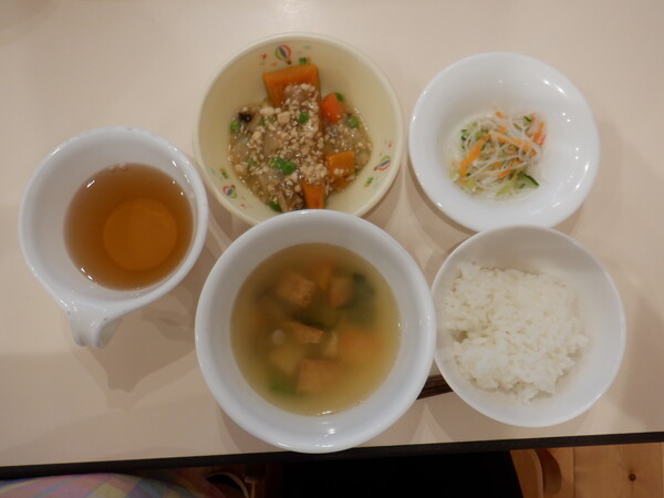 南瓜は玉葱、人参、グリンピース、干し椎茸が入った、鶏そぼろのあんがかかっています。