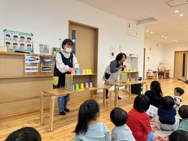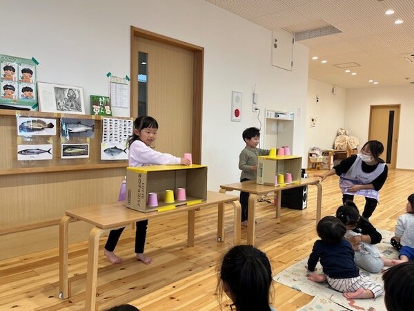 ゲームコーナーでは、応援している方が必死な顔!!箱に並べられた色の通りに、見らずに上にコップを並べるゲームでした。