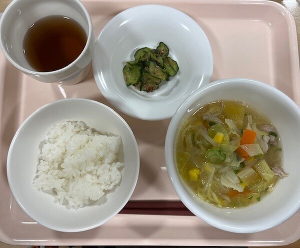 スープはじゃがいも人参玉ねぎキャベツえのきベーコン…たくさん具材が入っていて野菜のうまみが出た美味しいスープです。子ども達も職員も「おいしい」と言いおかわりをする子が多かったです。
