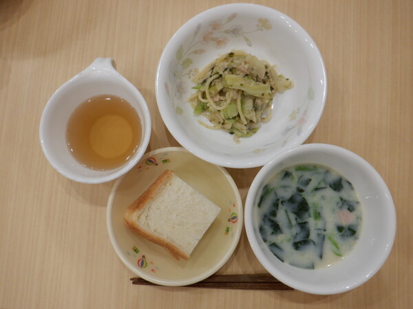 今日はパンと、にんにく、ツナ、海苔、みりん、しょうゆの味付けで人気のパスタと、スピニッチスープ。 スピニッチとは英語でほうれん草のこと。名前の通り、沢山のほうれん草とコーン、ベーコン、鶏がら、豆乳のスープでした。